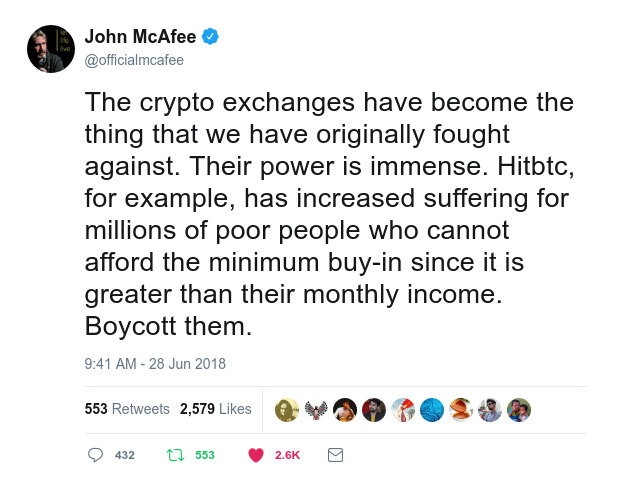 My Name is John McAfee. I am one of the major influencers of the Bitcoin and Crypto cause. Unfortunately, since this is a new technology it is filled with scams. One of these scams is Hitbtc. Hitbtc is an exchange monitored by the SEC. The purpose of crypto is to give power to the people and not to the power elite. Hitbtc charges enormous prices to join their exchange, and other hidden costs, that effect millions of people. For example, restricting the minimum purchase amount of Medical Token Currency (MTC) precludes every poor person on this planet. There are people who use a function called Docademic, which was created by the crypto community to give Free Healthcare to the world. This function is denied to all of the poor when Hitbtc charges thirty dollars for the minimum amount of MTC on their exchange. A thirty dollar price tag does not seem much to an American but it is thirty days rent for many people living in countries like India and the Philippines. This is the reverse of Robin Hood, the folk hero who took from those that had too much and gave to those that had too little. Please, if there is any humanity in your heart, look into this story and expose one of the most insidious scams ever created on those who have nothing.