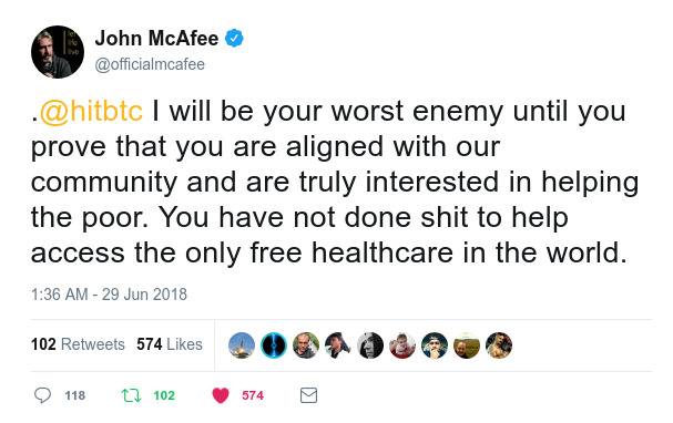 HitBTC is one of the few places MTC can be obtained and exchanged. However, the minimum transactions are so high (100 MTC) that the current value exceeds the monthly income of most people in countries where free medical services are needed the most. Forget about intentions – the real world effect of this policy is to deny poor people medical care. To McAfee, this is unacceptable.
